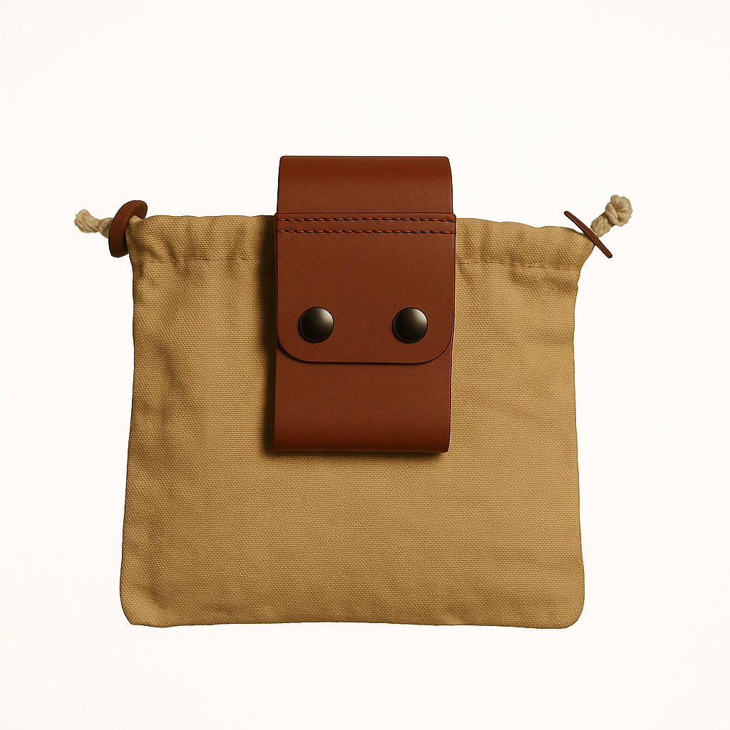 Dazu erhältst du eine robuste Aufbewahrungstasche in beige oder olivgrün mit Gürtelschlaufe und Druckknöpfen – perfekt zum Sammeln und Transportieren von Zunder oder anderen Kleinteilen.